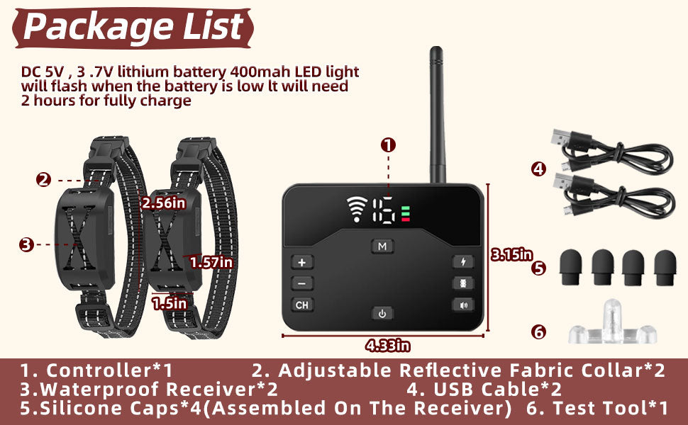 9-level adjustable sound/vibration/static modes with silicone prong caps for sensitive pets. Suitable for training beginners.